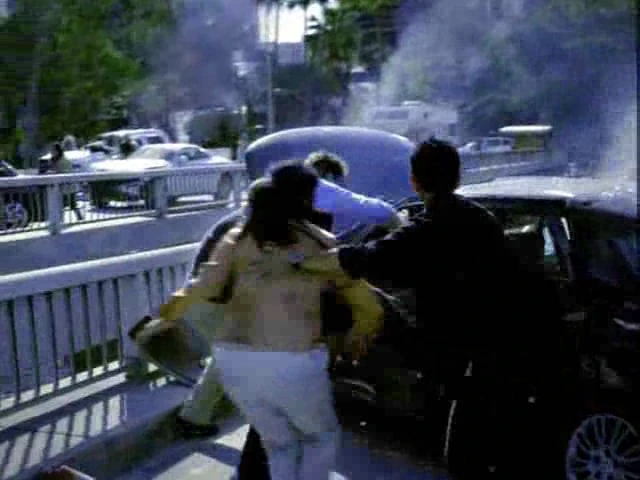 Mark escucha gritos femeninos desesperados pidiendo ayuda. Se acerca junto a Demetri y ve a esta mujer pidiendo socorro para sacar a un hombre, que probvablemente sea su marido, que quedó atrapado dentro del auto en la colisión múltiple que fue provocada por el apagón. Ambos agentes apartan a la señora y rescatan al hombre.