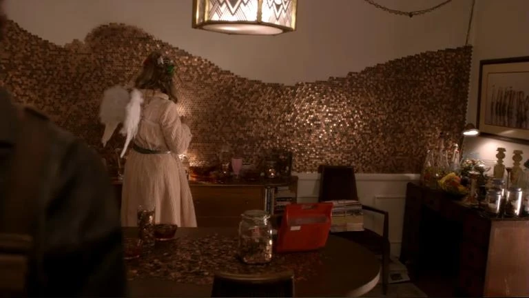 Afterward, Bryce accompanies Nicole home. He tells her of his reservations about religion. As they approach the front door, Nicole offers Bryce an opportunity to leave before he enters, explaining that her mother acts strangely if her medicine is not working correctly. Bryce wants to stay. They find Nicole's mother gluing pennies to the wall. She is wearing large paper clamps in her hair, but describes them as butterflies. Nicole's mother asks Bryce if he is a doctor. After he says he is, she tells him that she has been struck by lightening six times. Bryce glances at Nicole, who shakes her head. Nicole's mother specifies that only pennies from 1989 may be used on the wall. because that is the year Nicole was born. The penny wall is a tribute to her. Bryce asks Nicole's mother if she thinks God caused the FlashForward. She answers that it does not matter, claiming that she has a hallucination every day. She says that what some people call coincidence is really God at work. All three glue pennies to the wall.